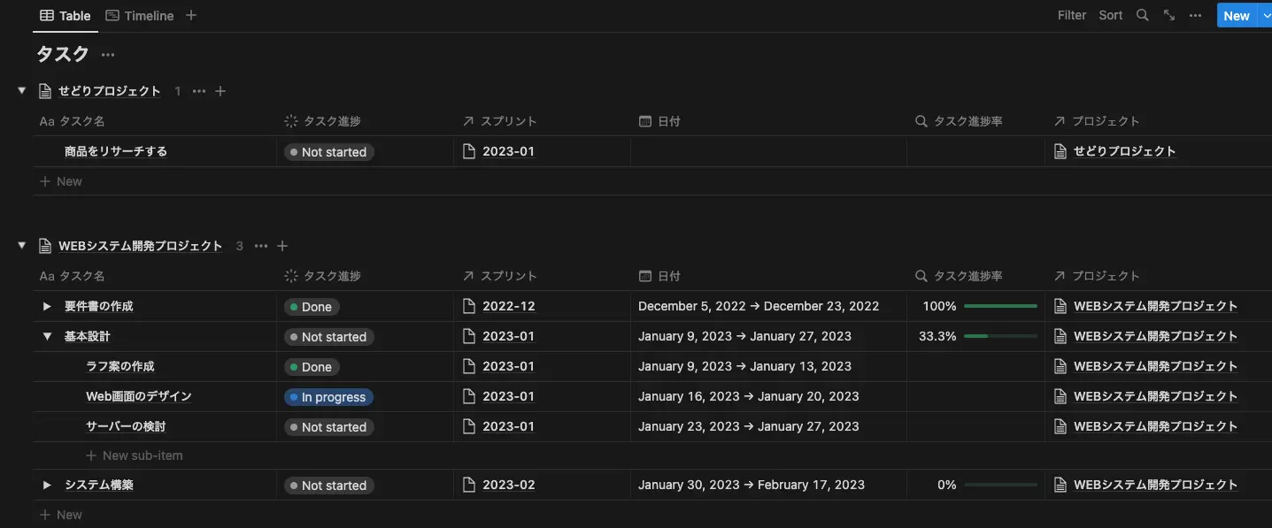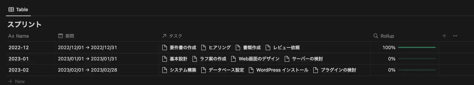 結果、「スプリント」テーブルは以下のようになります。進捗率を時間軸(期間)の単位で見ることができますね。