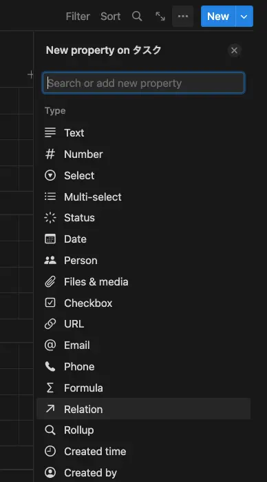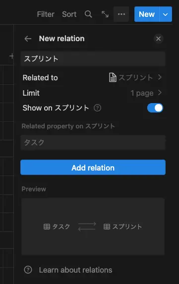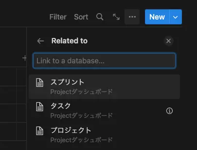 セレクト形式ではない手段として、Relation(別のテーブルと関連付けをするタイプ)を用います。ここで関連付けるテーブルは、冒頭に説明した「スプリント」テーブルとなりますね。