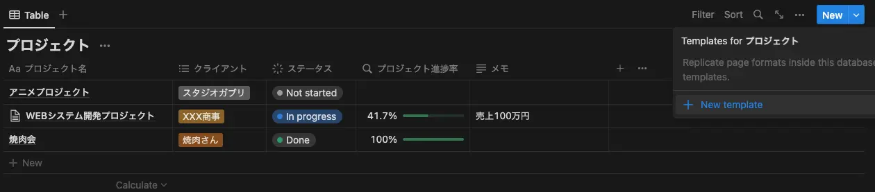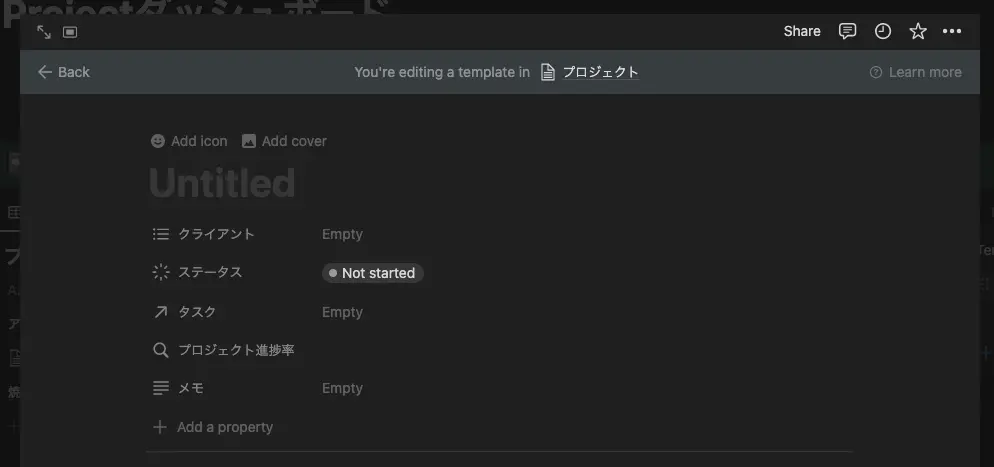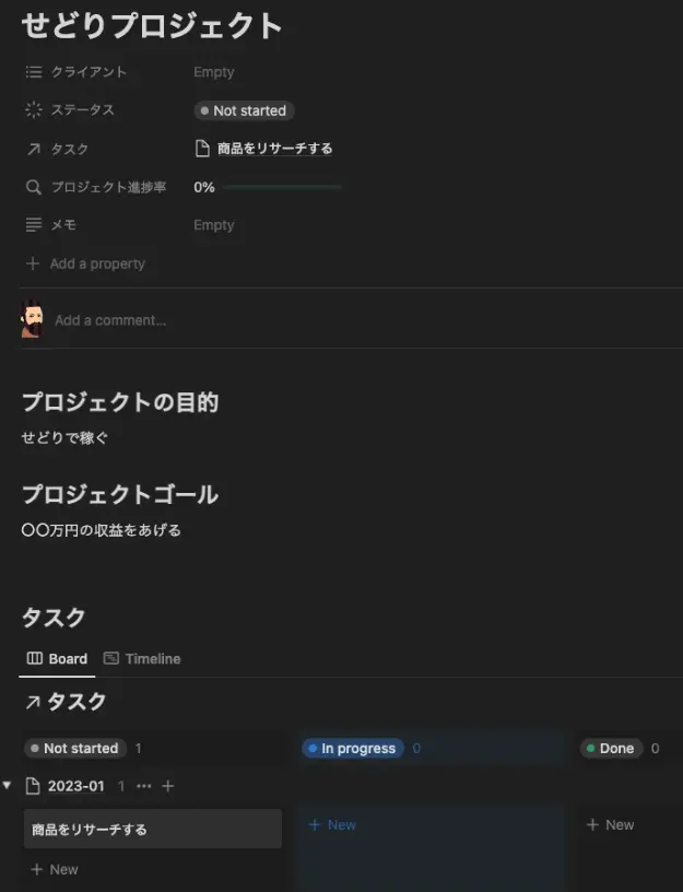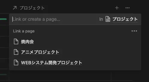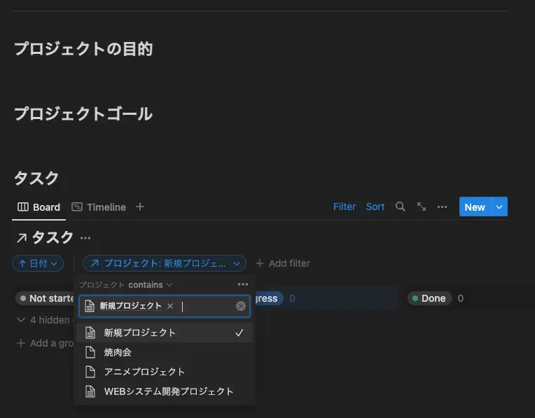 Notion では、テーブルなりのデータベースオブジェクトをフィルタリングした状態で「ページ」を追加した場合、そのフィルタされている値は自動で設定されるようです。つまり、プロジェクトを新規作成するページでは、テンプレート作成時に設定したように自分自身のプロジェクトをフィルタ対象としているので、追加したタスクには自動でプロジェクトが設定されるわけですね。