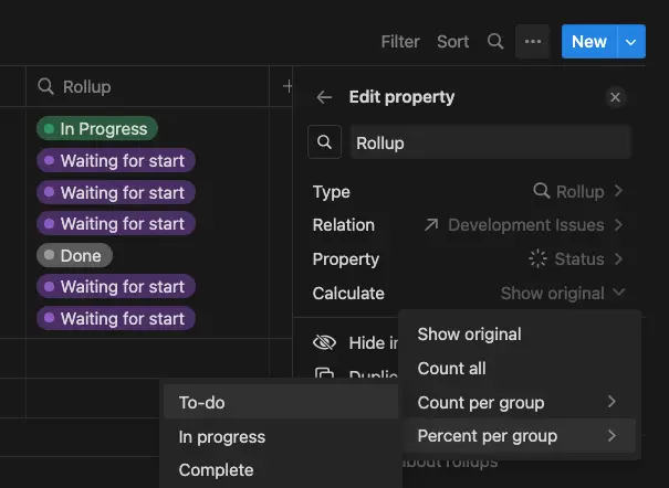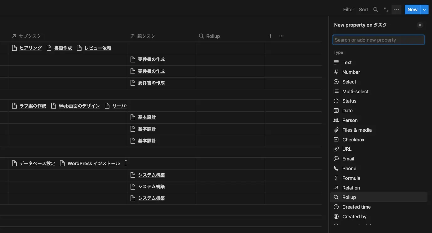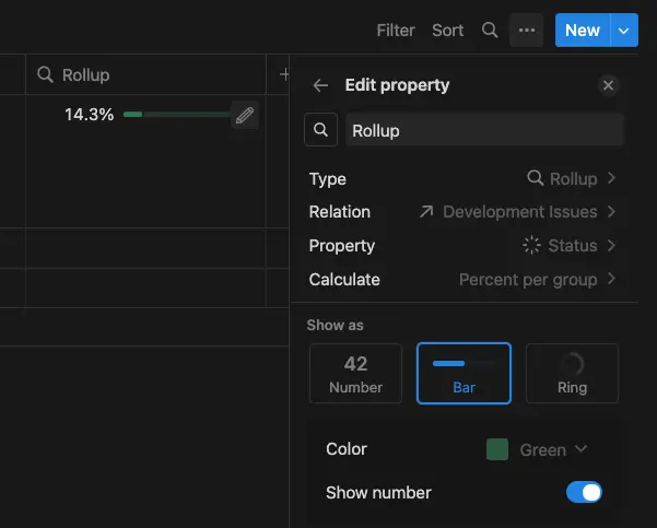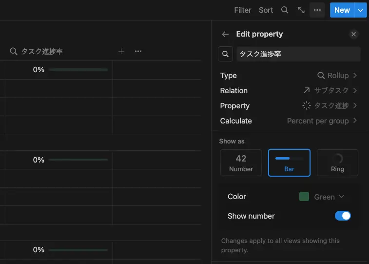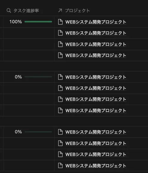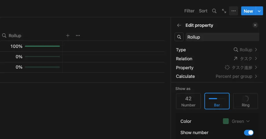 Type: RollupRelation: タスクProperty: タスク進捗Calculate: Percent per group → Complete