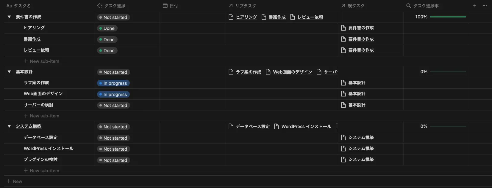 さてここで、「要件書の作成」のサブタスクを一通り完了にしてみます。すると、タスク進捗率が 100% になりました。