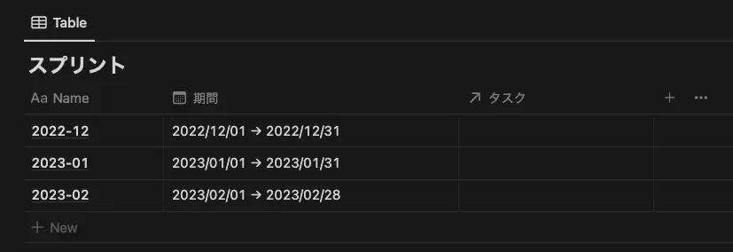 - 「スプリント」テーブル: その作業をいつ実施するのか、期間の概念を反映するためのテーブルです。例えば、「四半期」や「12月」、あるいは「プロジェクトStep1」のような任意の時間軸を表現します。