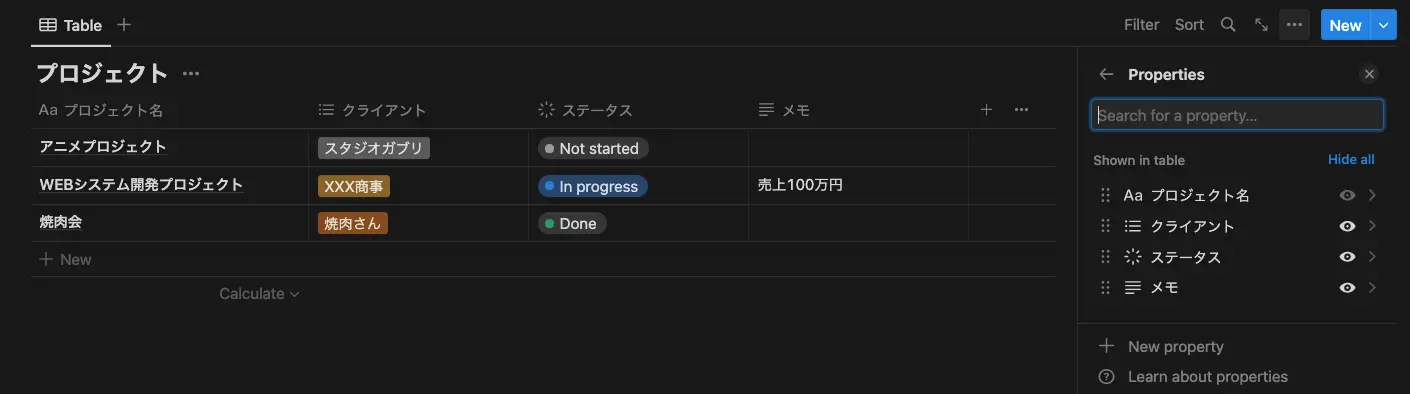 プロパティができたら、「タスク」それぞれに対して「プロジェクト」を設定していきます。