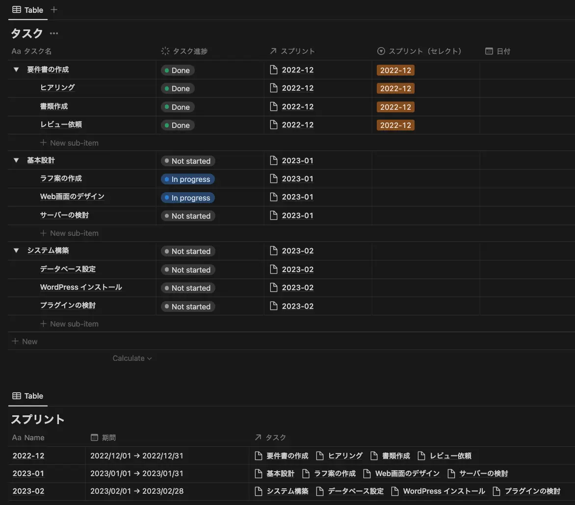 タスクに「スプリント」を設定したことで、「スプリント」テーブルにもタスクが表示されていますね。こうすることで、いよいよやりたかった「スプリント」ごとの進捗率の表現ができるようになります。(このために、わざわざ Relation によるスプリントとしました)
