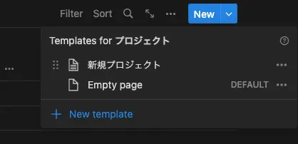 プロジェクト右上の青い「New」ボタンの横にある下向き三角ボタンから、「New template」を作成します。もし「New」から新規ページに移ってしまっても、そこから新規テンプレートを作成することもできるので、どちらでも構いません。